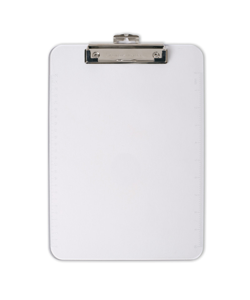 Stay organized and efficient with this clear letter-size clipboard made from tough, injection-molded plastic. Designed with smooth edges for comfort and durability, it features a low-profile clip with rubber grips to securely hold your papers in place without damaging them. A convenient pull-out hook on the back allows you to hang it for easy storage or display. Built right into the edge is a handy 12-inch ruler with inches on one side and centimeters on the other, making it a multifunctional tool for school, office, or job sites. Sleek, strong, and versatile, this clipboard is a smart solution for everyday tasks.