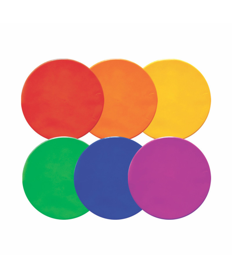 These versatile Champion Sports Extra Large Round Poly Spot Markers can be used for a variety of drills and games. They are great for setting up training stations in gym class or for teaching court positioning without the risk of injury or obstruction. Made of non-skid vinyl that won't tear or rip, this pack of six extra large spot markers comes with one each in red, orange, yellow, green, blue and purple. Size: 12" Diameter.