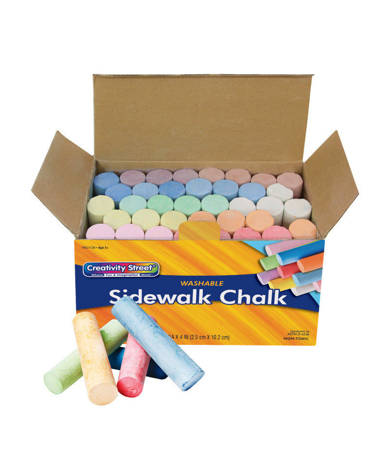 Now kids can decorate the sidewalks on Creativity Street®! Sturdy corrugated storage box features a lock-tab to keep flap secure when not in use. Large 4" x 1" diameter chalk pieces are easy for small hands to hold. Non-toxic and washable. Colors include red, yellow, green, light blue, dark blue, orange, pink, white, brown, and purple. Includes 36 pieces.