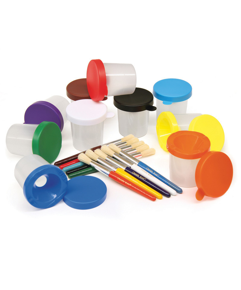Creativity Street® Paint Cups with Brushes set includes 10 color-coordinated 7.25" brushes and 10 three-inch diameter cups. These dual-lid storage cups prevent spilling. The outer lid securely seals the cup, while the inner lid keeps the paint from spilling out if the cup gets knocked over. The color of the lid easily identifies the color of the paint inside.