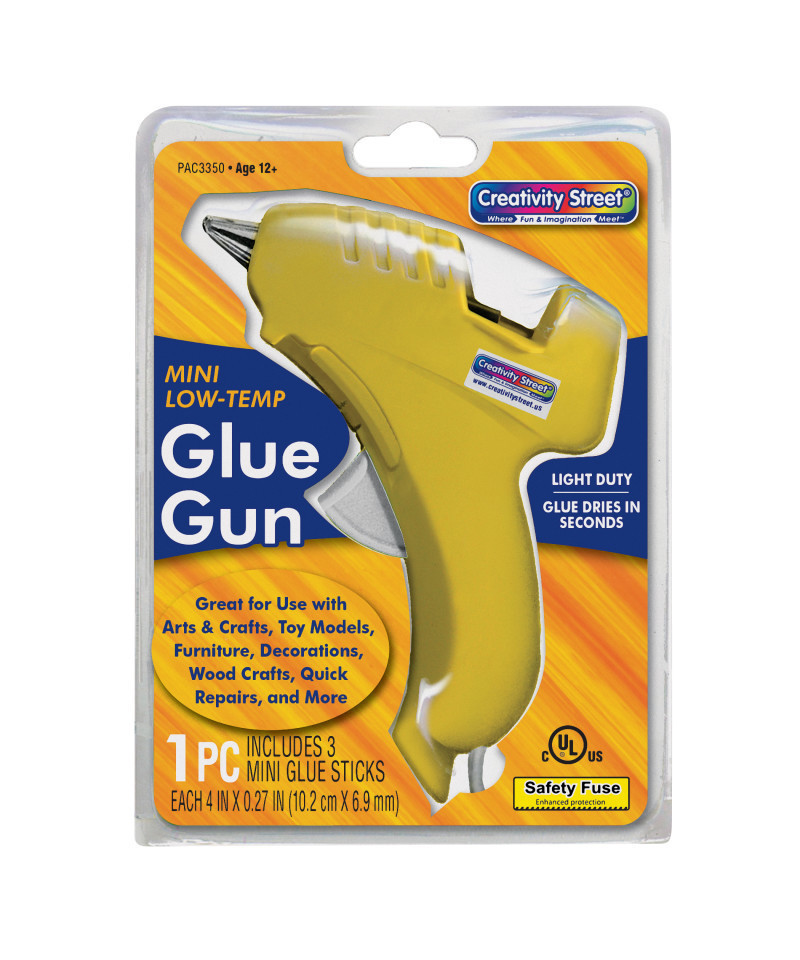 Mini-Glue Gun melts glue at 220 degrees F for safer use by young children. Uses 5/16" diameter glue sticks for quick repairs, toys and models, furniture, wood crafts and more. Plugs into any standard 120 volt electrical outlet. U.L. approved. Comes with three glue sticks. For ages 5 and up.