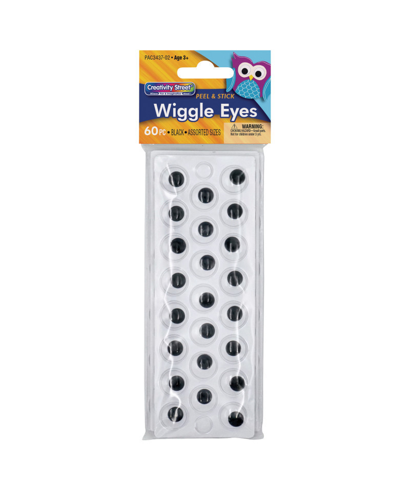 Bring projects to life with Creativity Street® Wiggle Eyes! These convenient Peel and Stick Wiggle Eyes are easy to adhere to different surfaces. Includes 60 black eyes in three sizes: 23 pieces of 15 mm, 20 pieces of 18 mm, and 17 pieces of 20 mm eyes. Ideal for the classroom, art room, daycare, or home.