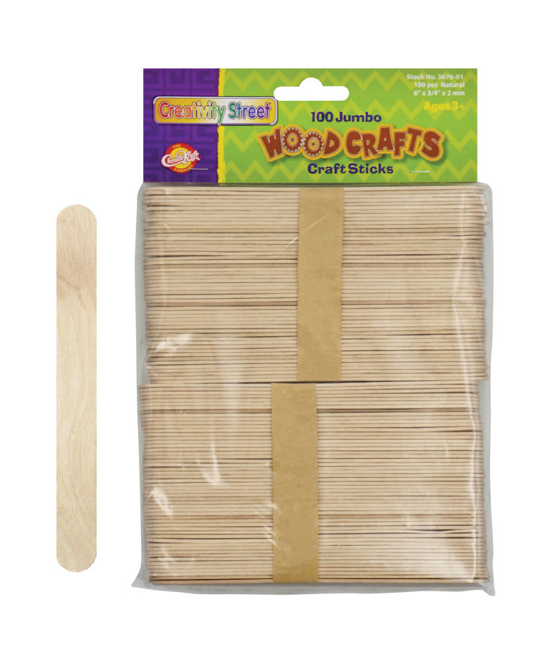 Jumbo craft sticks are the size of "tongue depressors", and are ideal for any arts and crafts project. Each stick is 6" in length, .75" wide, and 2 mm thick. These wood sticks accept many types of glue and paints, and are ideal for building 3D projects and structures. Construct a castle, build a bridge, or make a crate. Each pack includes 100 sticks.