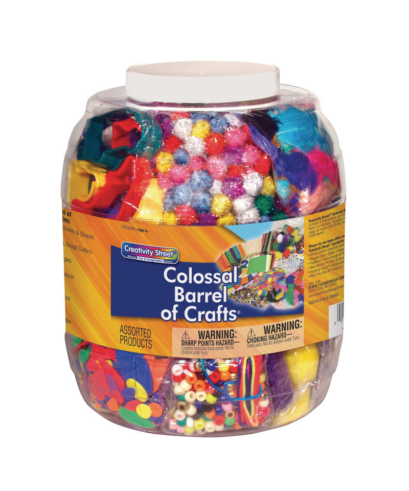 The Colossal Barrel of Crafts includes a tremendous assortment of popular craft items in a durable, reusable storage container. Includes Feathers, Pom Pons, Chenille Stems, Wiggle Eyes, Buttons, Dough Cutters, Modeling Clay, Glitter Poms, Jumbo Craft Sticks, WonderFoam® Shapes and Sheets, Sequins & Spangles, Pony Beads, Rainbow Cord and Glitter Glue Pens. Get ready for some COLOSSAL fun with clay!