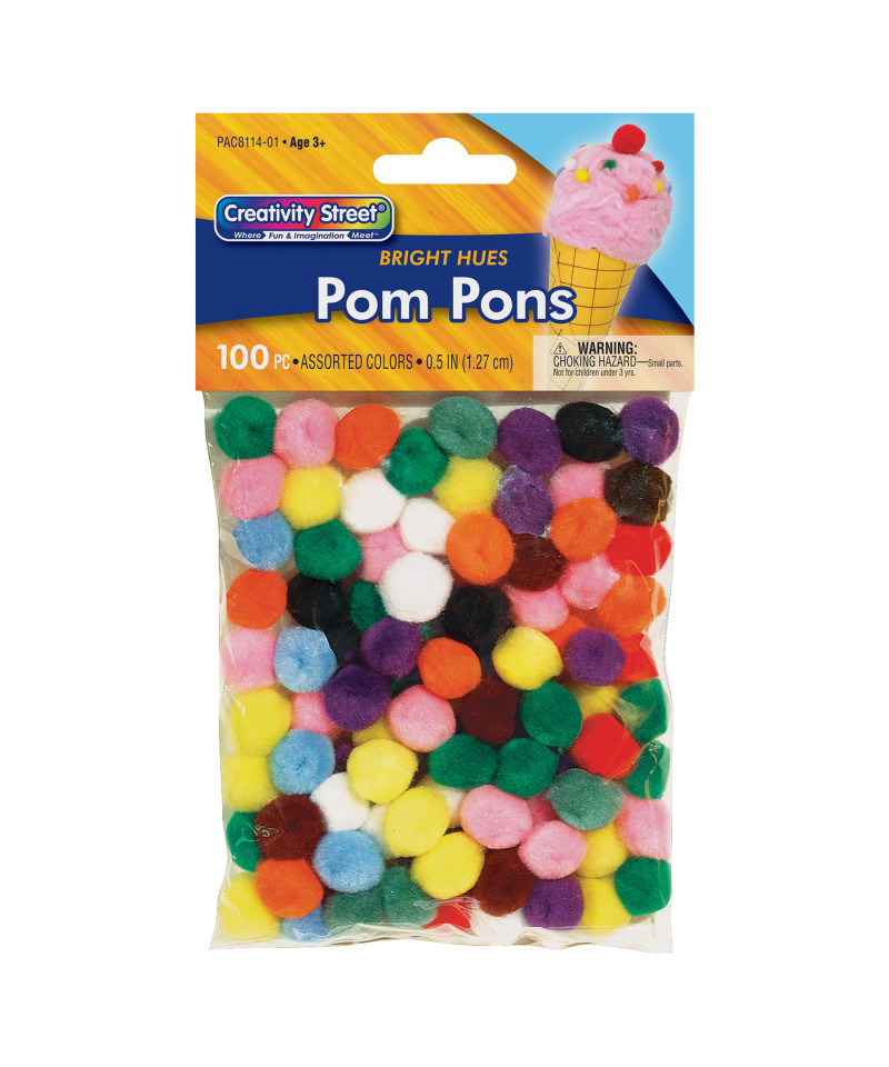 Soft and crush resistant Pom Pons are great for making dolls, ornaments or wherever your creativity takes you. These 0.5" poms provide a variety of colors for all types of arts and crafts projects. Each pack includes 100 poms.