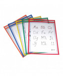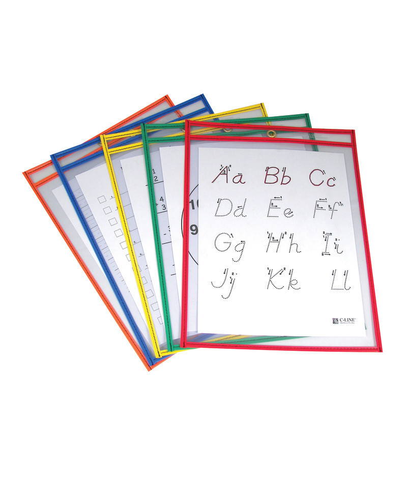 Reusable Dry Erase Pockets help to improve students' skills. Anyone can easily practice math problems, letters, writing skills and more. Helps to save the environment, paper, time, and money by eliminating copying worksheets over and over again. Reusable super heavyweight pocket lasts a long time. Convenient eyelet for hanging. Easily clean with a soft dry cloth or tissue when used with a low-odor dry erase marker or dry erase crayon (not included). Insert Size: 9 x 12, or smaller sized papers. Each pack includes 5 pockets, 1 each of primary colors: red, orange, yellow, green and blue.