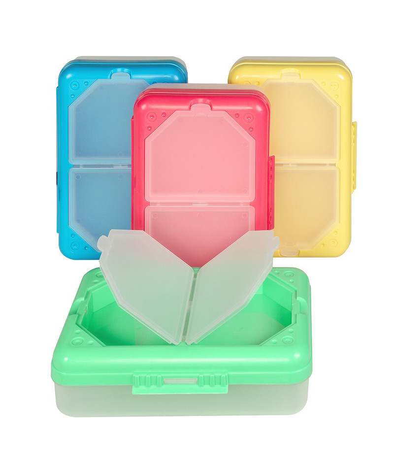 Durable storage box features three compartments for maximum organization. Large bottom compartment is ideal for office and school supplies. Two compartments in the lid hold smaller items. Sold individually in assorted Tropic Tones colors: Seaside Blue, Sunny Yellow, Seafoam Green, and Sunset Red (no color choice).