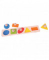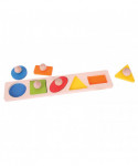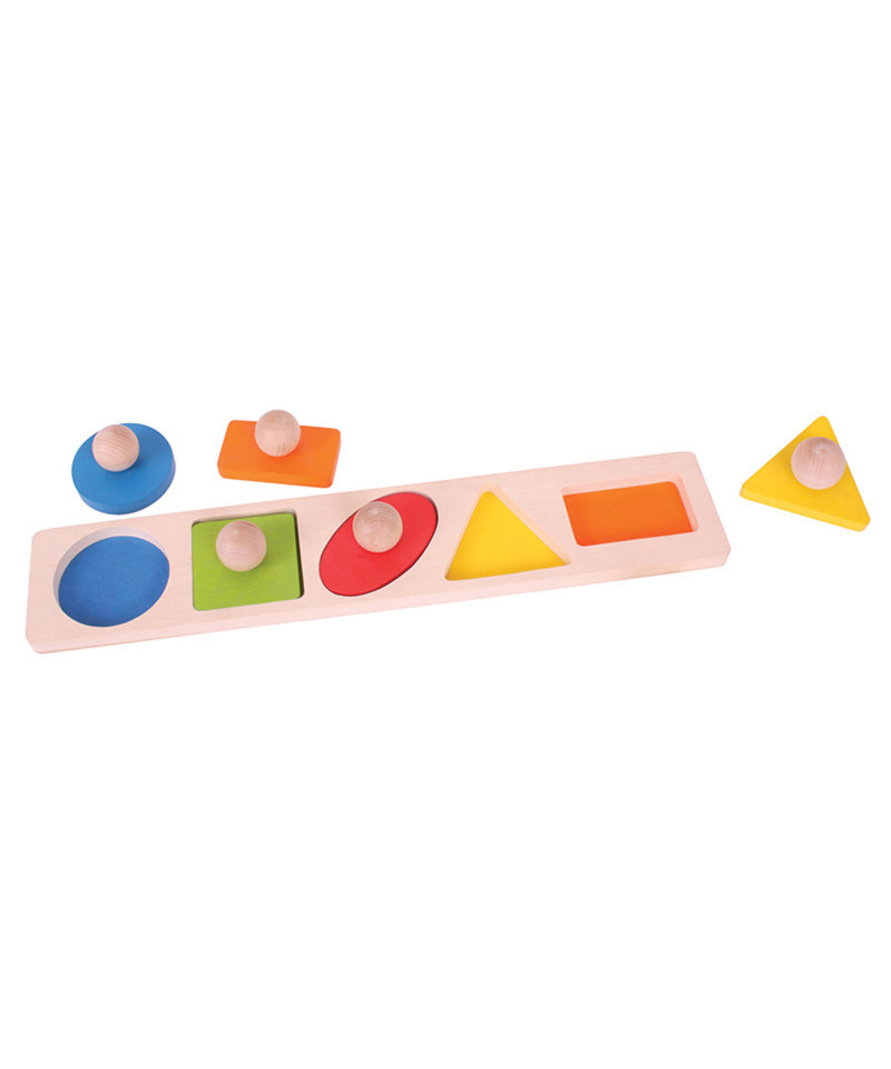 Match each brightly colored wooden piece to the correctly shaped slot on the base board. Easy to lift wooden puzzle pieces feature a pegged handle on each piece. Each chunky wooden puzzle piece is generously sized to make it easier for little hands to lift, grasp, examine and replace. Helps to develop dexterity, matching skills and concentration. The wooden base boards of Bigjigs Toys puzzles are printed with images or colors to aid the learning process and add educational value. Made from high quality, responsibly sourced materials. Conforms to current U.S. safety standards. Age 1+ years. Width: 18 1/2 in. 5 puzzle pieces.