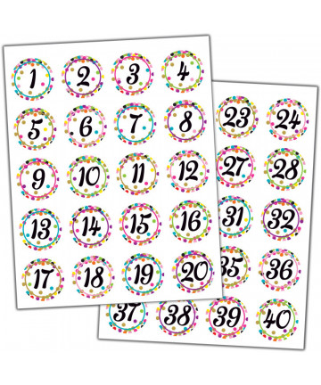 Confetti Numbers Stickers are acid-free and lignin-free. Measure approximately 1". Each pack includes 120 stickers: numbers 1-40 in 4 colors Add to cart Teacher Created Resources® Confetti Numbers Stickers $2.99