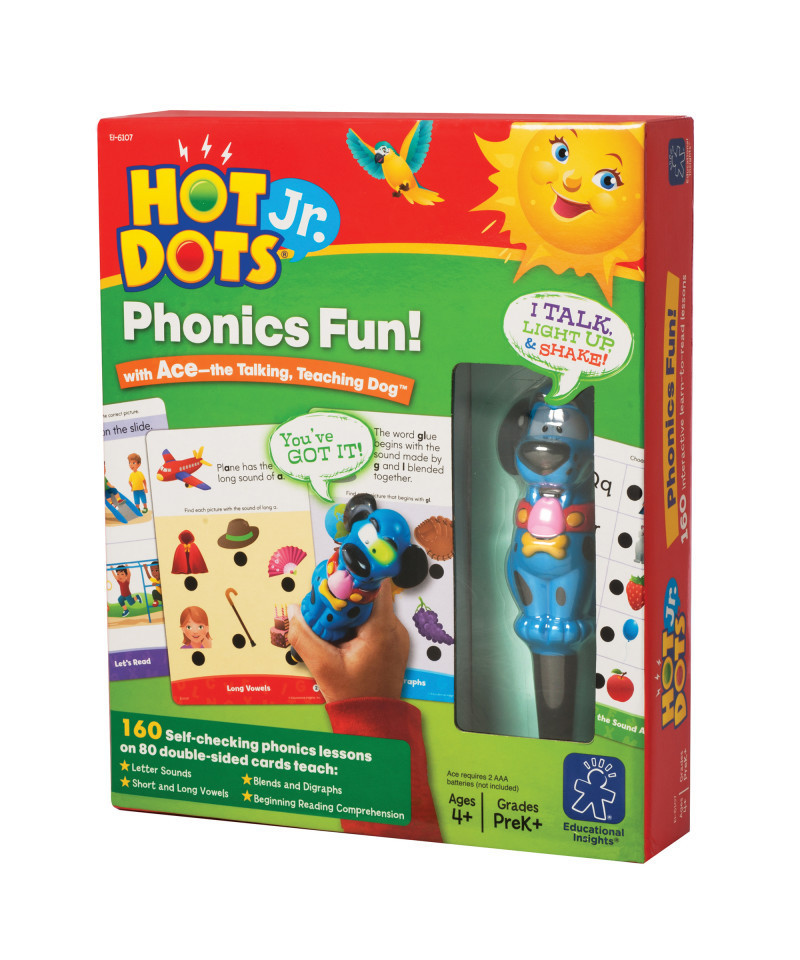 - Add some fun to phonics practice with this colorful, interactive Hot Dots Jr. set and Ace—the Talking, Teaching Dog pen.