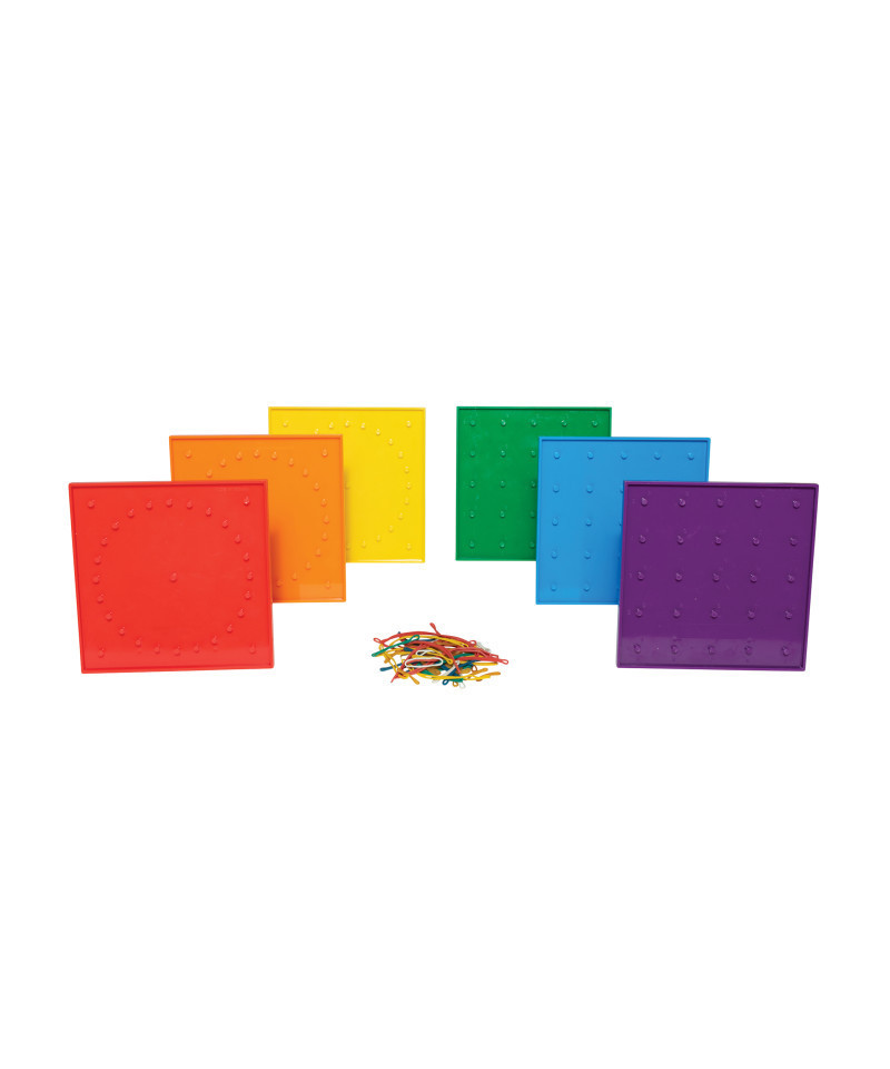 - 6 DOUBLE-SIDED BOARDS, 120 BANDS -- This set includes 6 double-sided geoboards with a 25-pin grid on one side and 24-pin circular array on the other. Also includes 120 assorted rubber bands.