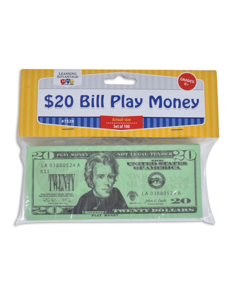 - 100 $20 BILLS INCLUDED -- This set of twenty dollar play bills is great for solitary or group play and an ideal resource for the home, center, classroom or playroom.