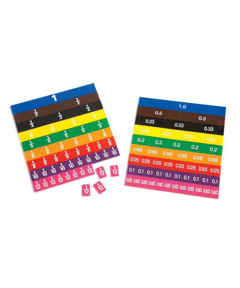 Color-coded tiles expand the learning of fractions and decimals. Double-sided tiles ease comparisons between fractions and decimals. Includes 51 double-sided pieces in 9 colors representing 1, 1/2, 1/3, 1/4, 1/5, 1/6, 1/8, 1/10, 1/12. Fractions printed one side / decimals on reverse. Includes storage tray.