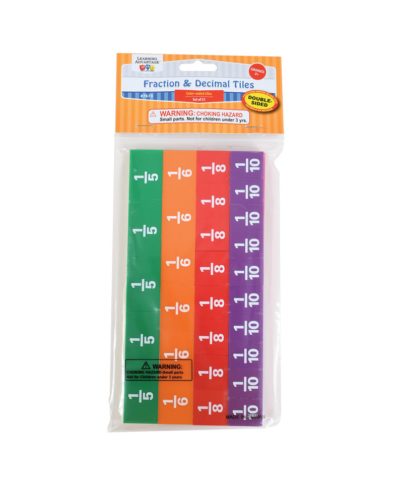 Color-coded tiles expand the learning of fractions and decimals. Double-sided tiles ease comparisons between fractions and decimals. Includes 51 double-sided pieces in 9 colors representing 1, 1/2, 1/3, 1/4, 1/5, 1/6, 1/8, 1/10, 1/12. Fractions printed one side / decimals on reverse.