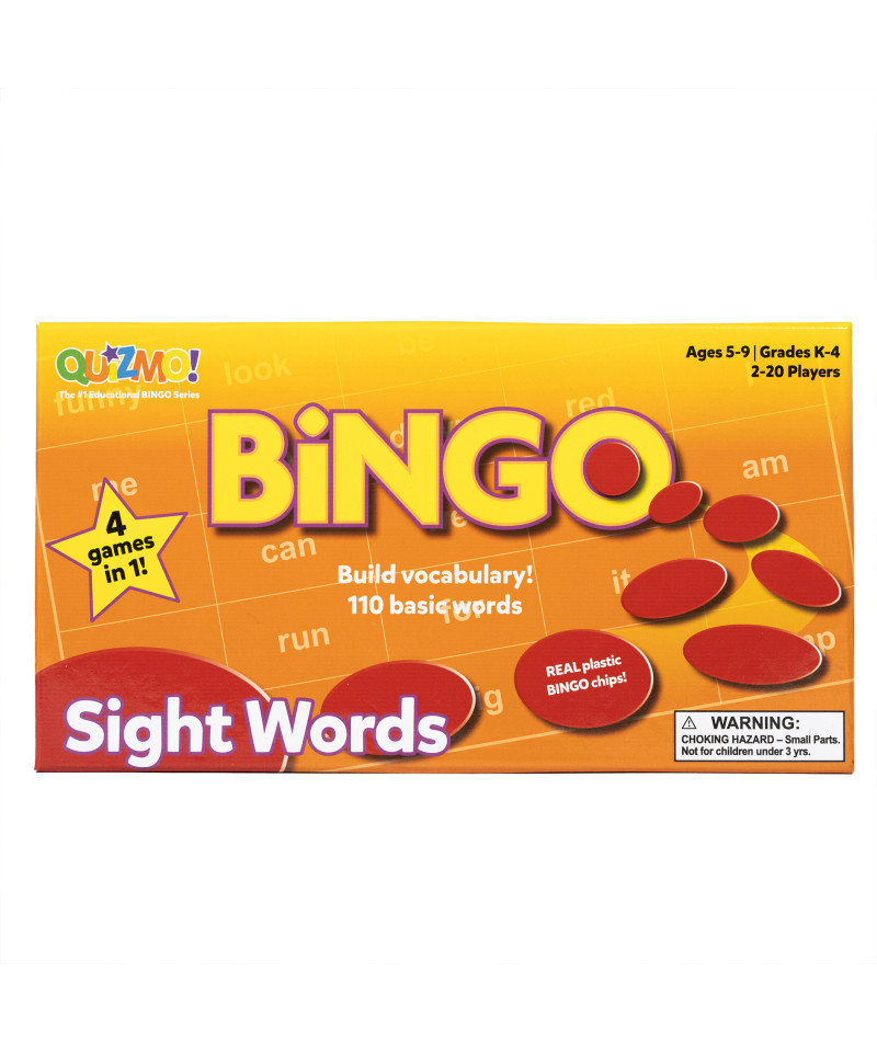 Popular bingo format provides word recognition practice for 110 Basic Sight Words. Set includes 110 words in 4 different games at increasing levels of difficulty. Gives children practice in recognizing 110 basic sight words. After playing Sight Word Quizmo® students will: better recognize the basic sight words that they have previously encountered in their reading, increase their ability to discriminate between words, improve their reading skills, and look forward to more word recognition practice through an enjoyable activity. Designed for students at first or second grade reader level. Games increase in difficulty from Game A (easy) through Game D (most challenging). To accommodate up to forty players, just add a second Sight Word Quizmo® - the group can then enjoy a possible second winner for each round. 40 double-sided game cards, 55 double-sided calling cards of words for each game, plastic markers and instructional guide.