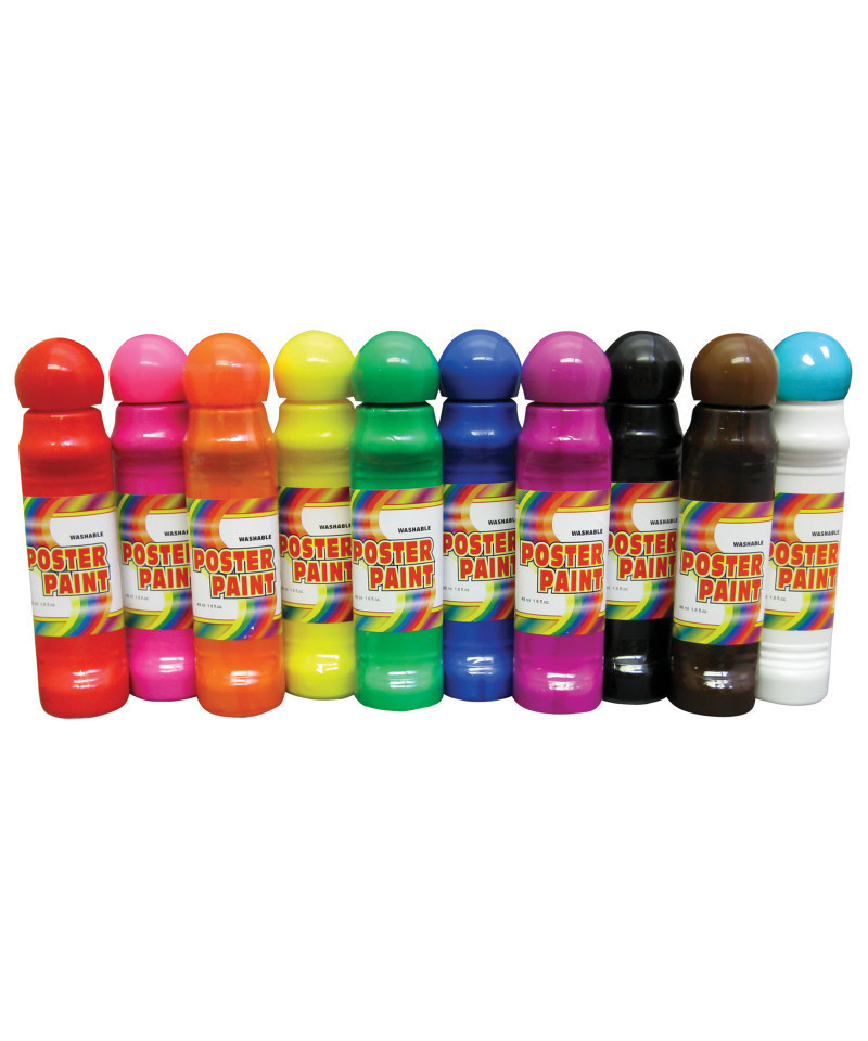 The Crafty Dab 1.62 oz. Poster Paint comes in 10 assorted colors packed in ergonomic shaped bottles for easy hold and control. Bring home the Crafty Dab Poster Paints for a myriad of art projects. Foam applicators make the paint easy to apply. They are quick to dry and easy to paint directly. Designed with special spring mechanism, these poster paints do not leak or spill during application. Non-toxic paints for kids. Washable paints easily clean up from fabrics and skin.