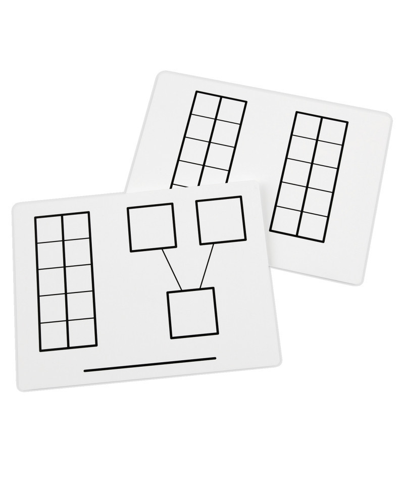 Tough, flexible plastic mat has ten frame and number bond outline on one side and two ten frames on reverse. For use with dry-erase markers. Mats measure 9" x 12". Pack of 10.