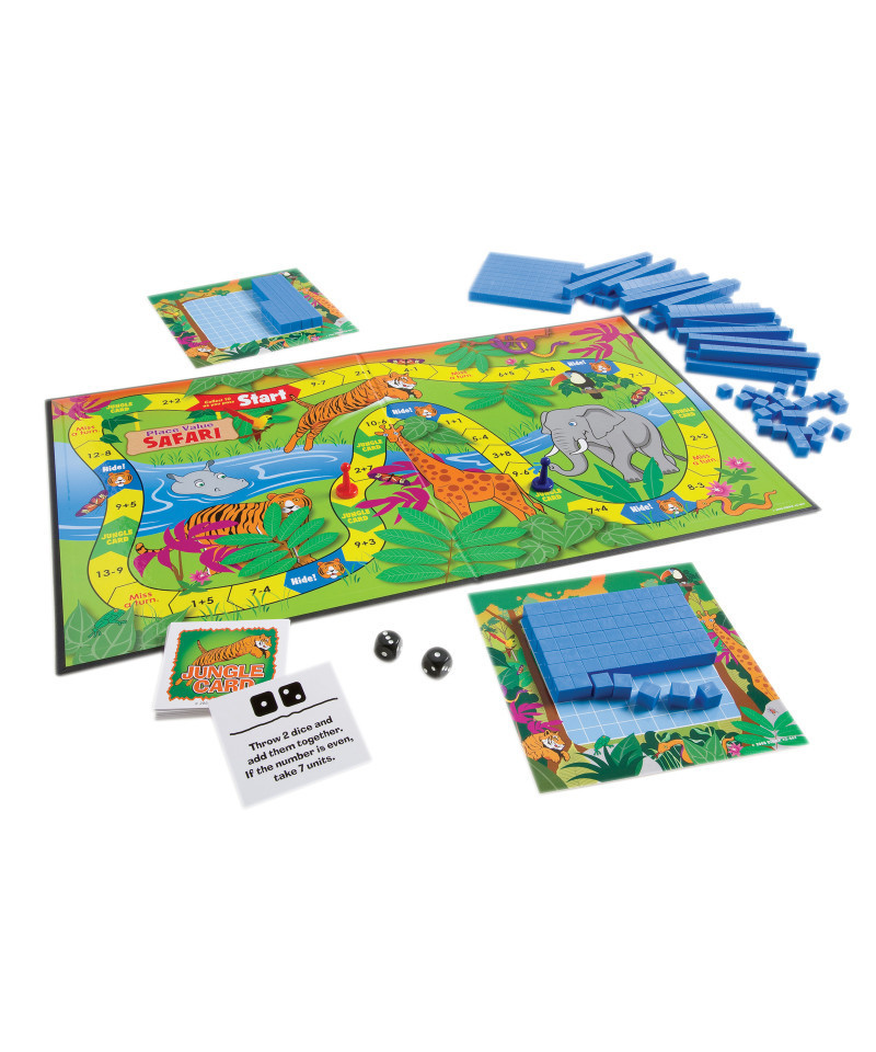 - Players must fill their safari boards with base ten units and rods to escape the tiger