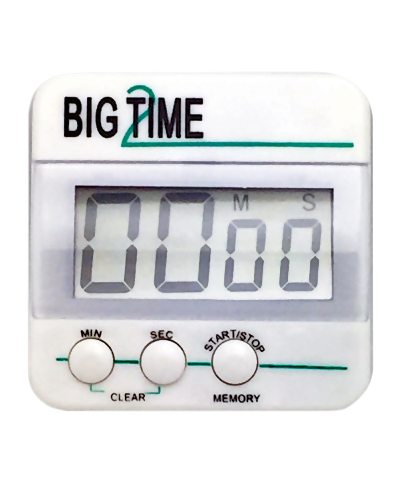 Big Time, Too timer counts 100 minutes up or down, with an alarm. Also includes magnet and stand on back. One AAA battery is required (not included). Measures 2.5" x 2.5".