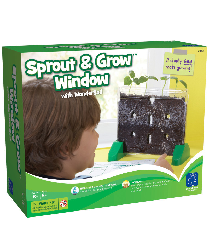Get a Worms-Eye View of Root Growth. This transparent "natures window" allows gardeners of all ages to watch seeds sprout and grow into plants-right before their eyes! The large, transparent Sprout & Grow Window stands upright on a tabletop or windowsill. Special potting soil nurtures seeds for optimum growth. Comes with packets of bean and pea seeds, and a step-by-step guide with instructions, suggested activities, and journal pages to fill in as you follow the process from seed planting to full-grown plants.