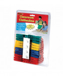 Running out of wall space? Need more room to display flash cards, art projects, student work, and announcements? Your solution is the Classroom Clothesline. Here's everything you need to create a clothesline in your classroom. You get 50 feet of strong vinyl-cloth line and 48 colorful plastic clothespins. Cut the line to the length you need then tie it to each of the two adhesive wall mounts included in the pack. Secure the mounts to the wall and you're done. No more struggling with ceiling tiles or sagging yarn.