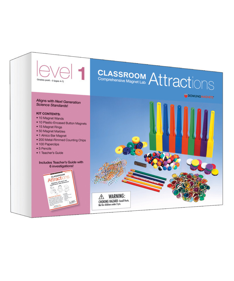 Supplement your science curriculum with comprehensive magnet kits aligned with the Next Generation Science Standards! Investigate motion and stability, matter and its interactions and more. Designed for groups of 5-10 students. This classroom kit contains: 5 pencils, 5 button magnets, 10 disc magnets, 10 Magnet Wands, 15 ring magnets, 50 magnet marbles, 100 colored paper clips, 200 magnetic counting chips, demo bar magnet, teacher activity guide. Level 1 is designed for Ages 4-7 / Grades PreK-2.