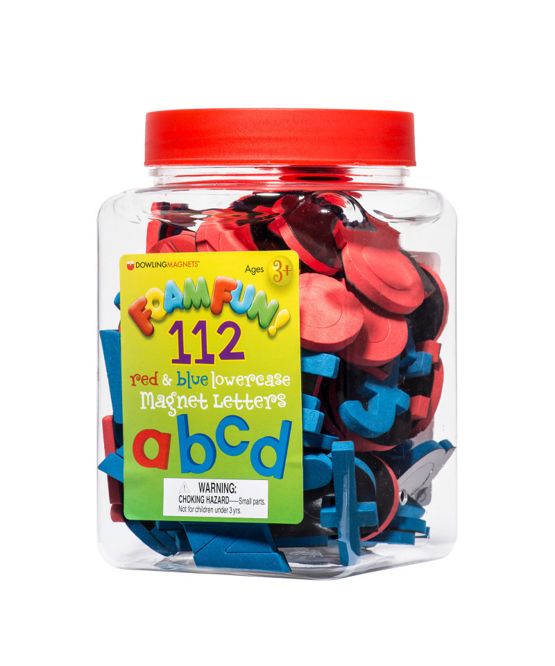Made for little fingers! Flexible foam is chunky and easy to handle. Perfect for identification, phonics, and word building/spelling activities. Red and Blue sets are color coded to help kids differentiate vowels from consonants. Each letter measures 1"-2" tall. Includes 112 magnetic letters and storage container. In the red and blue Foam Fun letter sets, "y" and "w" are now included in both red (vowel) and blue (consonant) colors since these letters also can be vowels (diphthongs: "ew," "ow," " ay," "oy," and more). Each set includes 112 Foam Fun Magnet Letters: 49 red: 9 each vowel, 2 "y" & 2 "w", 63 blue: 3 each consonant (including "y" & "w"). Also includes a storage container.