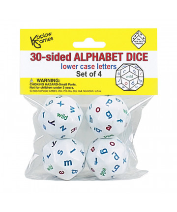These 30-sided dice provide unlimited opportunities for fun, games and learning! Each die contains all 26 lowercase letters of the alphabet and 4... Add to cart Koplow Games 30-Sided Alphabet Dice, Lowercase, Set of 4 $19.00