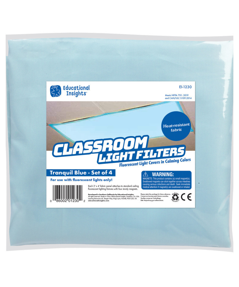 Fluorescent lights are a staple in classrooms, but their harsh glare and flickering light can cause eyestrain, headaches, and anxiety in students. Cover your classroom fluorescent lights with these fabric panels that fit over standard ceiling fixtures with sturdy, sewn-in magnets. Each set includes four 2' x 4' heat-resistant panels in Tranquil Blue. For use with fluorescent lights only!