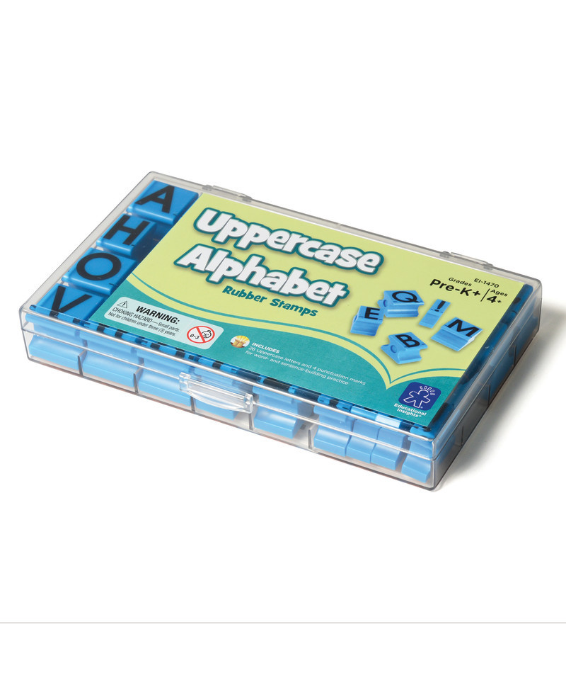 Stamp, spell, and play with the Uppercase Alphabet Rubber Stamps from Educational Insights. These high-quality rubber stamps with easy-grip handles are the perfect size for little hands. Each set comes in a durable, clear plastic storage case for easy clean up and storage. Perfect for learning letters, spelling, sentence building, and craft time! Each set includes 26 letters and 4 punctuation marks.