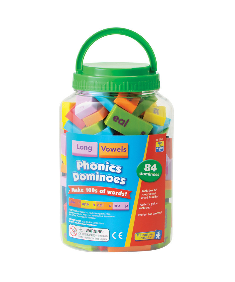 - Dominoes are in bright colors and preprinted with most-often-used consonants and 27 two- and three-letter long vowel word families