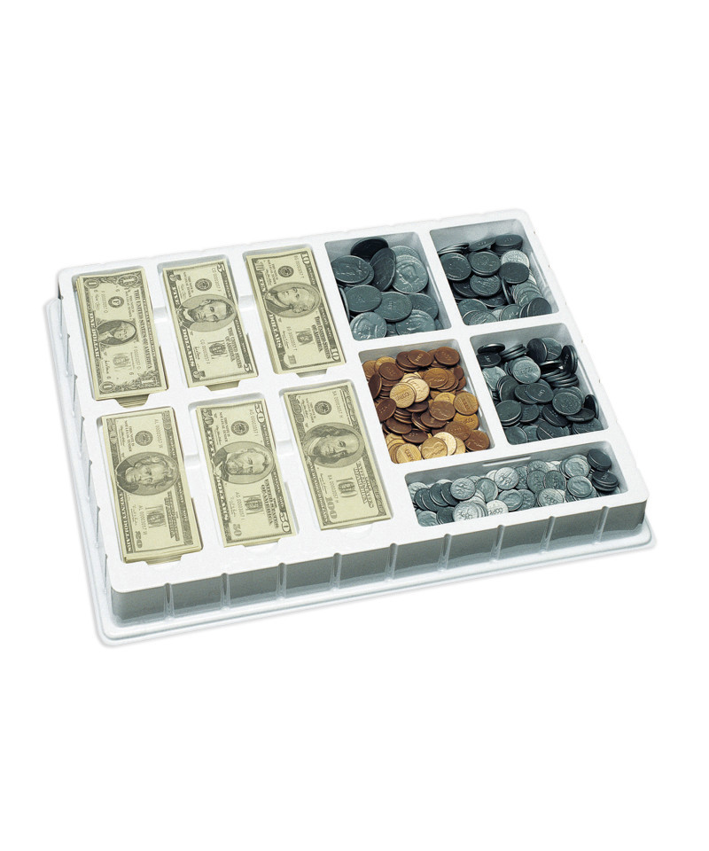Perfect for money math activities in centers or imaginative play. Features realistic looking plastic coins and paper bills (not actual size) that help children learn to recognize different denominations. Supports math-related life skills, including counting, addition, subtraction, making change and balancing a budget. Makes a great addition to pretend stores and other imaginative play scenarios. Includes coins from pennies to half-dollars and bills from $1 to $100 (750 pieces in all). Stores all pieces in convenient tray for easy cleanup. Grades K+. Choking Hazard - Small Parts, not for children under 3 years.
