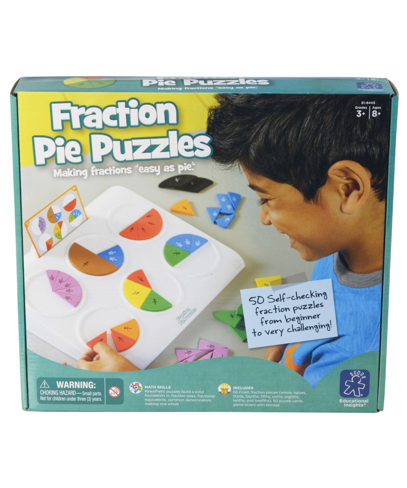 Making fractions "easy as pie."Each Fraction Pie Puzzle is a puzzle and a conceptual fraction lesson, all rolled into FUN! Select a card, place the starting pieces, and then complete the circles with the remaining fraction pie pieces. Will one-third solve the puzzle? What about 2 one-sixths? This kinesthetic way to reinforce basic fraction concepts teaches students how fractional parts make up a whole and about equivalencies, common denominators, and multiples. Leveled from easy to difficult and self-correcting, the puzzles are perfect as a small group or center activity. It's an entertaining way for students to challenge their brain and understand fractions! Includes game board, 50 leveled puzzle cards (easy to challenging), 65 foam fraction pieces, and guide. Solutions included for every puzzle. For 1 to 2 players.