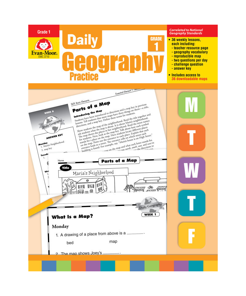 - In Daily Geography Practice, Grade 1, 36 map lessons introduce basic geography skills and over 60 geography terms