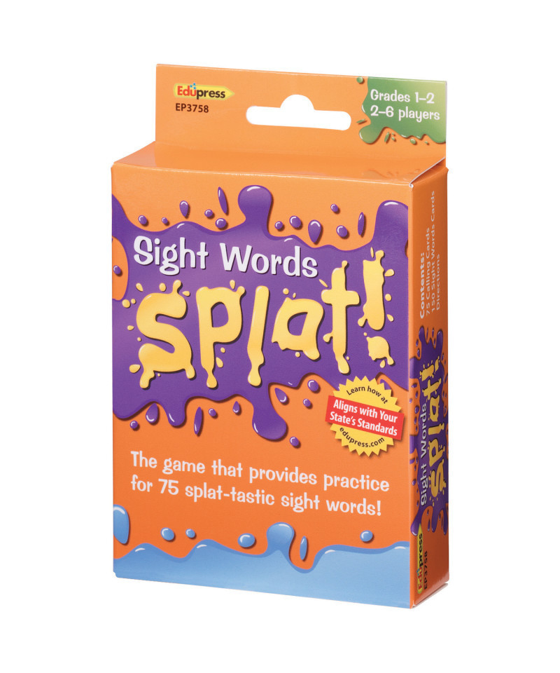 Fast-paced games provide practice for 75 splat-tastic sight words! As the caller reads each sight word aloud, players scan the cards in front of them. If a player has a matching word, he or she says "SPLAT!" and flips the card over. The first player to flip over all of his or her cards wins. Three color-coded decks make it easy to adapt the game for one-on-one practice or multiple players. For 2-6 players. Set of 225 cards. Cards measure 3.5" x 2.25". Grades 1-2. Aligned with Common Core and State Standards. Supports requirements of Title I and other federally funded programs.