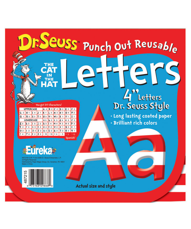 Try Eureka Reusable Punch Out Letters. Printed on coated paper with brilliant rich color, they are perfect for creating personalized projects in displays. Each letter measures at 4". Punch-out, reusable. Long lasting coated paper. Brilliant rich colors, fun and decorative. Each pack includes 217 characters.