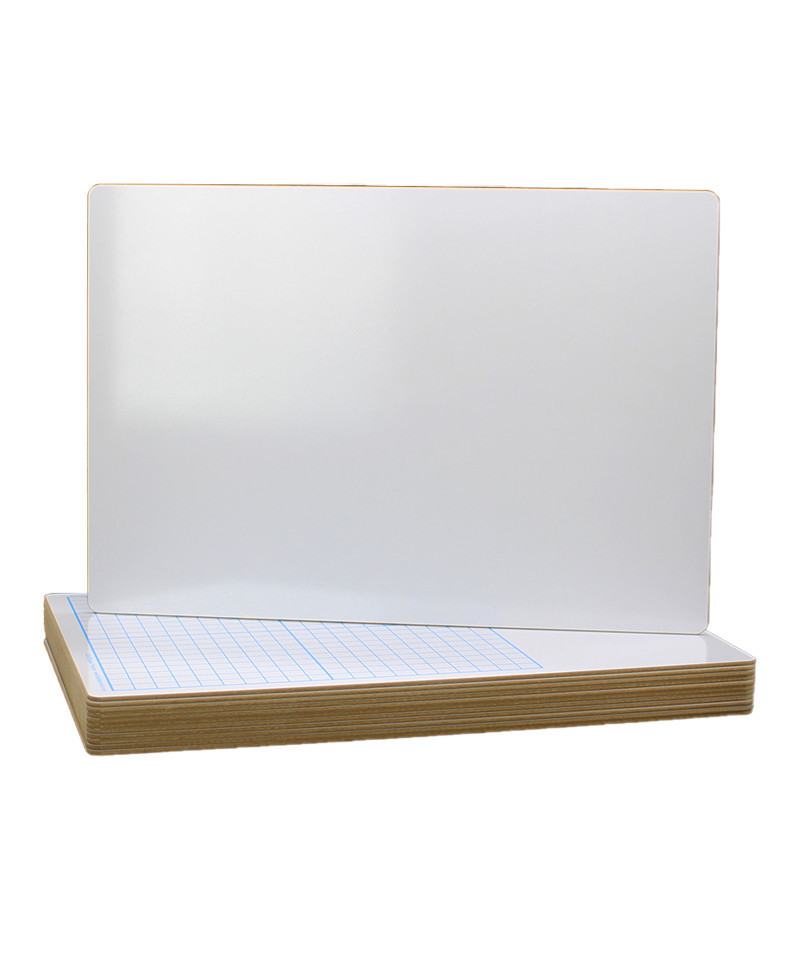 Make learning more fun with dry erase boards. Non-ghosting, chip and warp resistant board Graphing practice on dry erase boards saves paper! Bold lines separate board into quadrants each 10 squares by 10 squares; total grid is 20 squares by 20 squares. Individual squares measure 1/2" x 1/2". Plain work space is 11" x 5-1/4". Plain board on opposite side. Boards feature non-ghosting dry erase surface with rounded corners and smooth edges for safety and comfort. Durable hardboard backing is warp and chip resistant. Measures 11" x 16" x 0.125". Pack of 12 Dry Erase Boards.