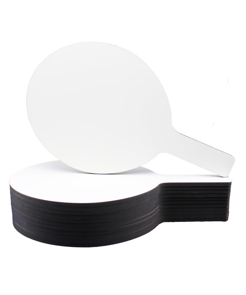 Quick and quiet whole class participation made easy with Dry Erase Answer Paddles. Great for review sessions, surveys, assessment and more! Non-ghosting dry erase surface with a rounded shape, an easy grip handle and smooth edges. Hardboard backing is warp and chip resistant. Measures 7" wide x 12" high x 0.25 deep". Pack of 12. Made in USA.