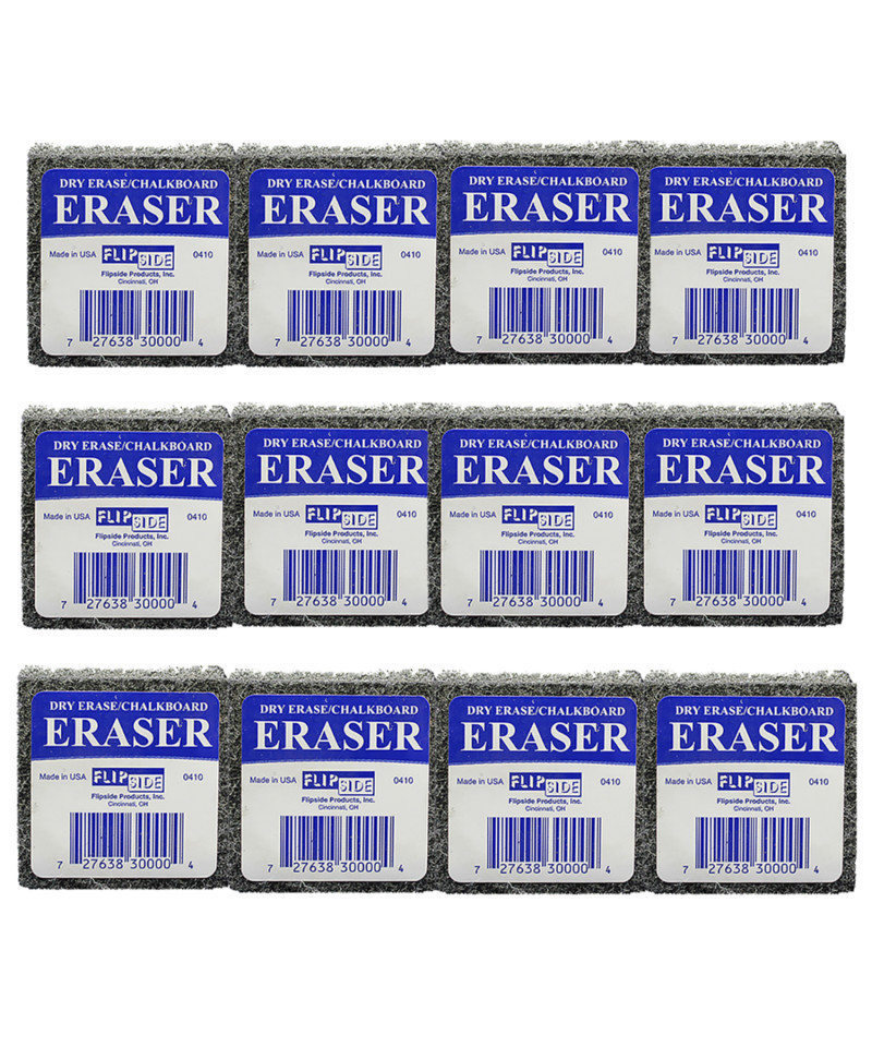 Erasers for dry erase and chalk boards are sized with students' hands mind. One piece dense felt construction will not unravel for extra long use. Works for both dry erase/chalk surfaces. Erasers measure 2" x 2" x 1". Class Pack 12. Made in USA.