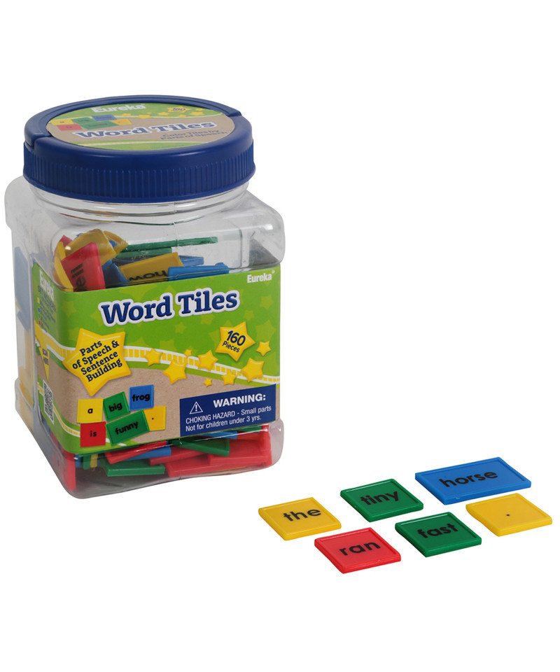 Eureka Manipulatives are great for teaching early childhood learning and a great tool in helping students recognize connections within each educational topic. Each pack includes 160 plastic color-coded word tiles divided into groups of nouns, verbs, adjectives and miscellaneous parts of speech in a plastic storage tub. Teaches sentence building and parts of speech. Plastic tub measures 3.75" x 5.5" x 3.75". Not for children under 3 years of age.