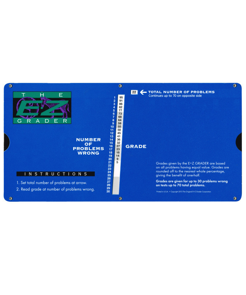 We are proud to introduce the latest addition to our line of quality slide charts for the educator, the Large Print Royal Blue E-Z Grader. Scores up to 70 problems with up to 30 problems wrong. Actual size is 10" x 5".