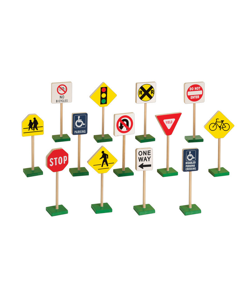 This set of 13 prominent traffic signs teach safety and accurate recognition of standard road-way signs at an early age while satisfying a child's curiosity and fun for block play. Create complete road-ways with our Plywood Trucks and Vehicle collection. Signs are made from wood and stand on sturdy, non-tip bases.