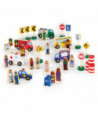 - Set includes 6 vehicles, 12 signs, 6 community workers and two separate 4-piece family sets