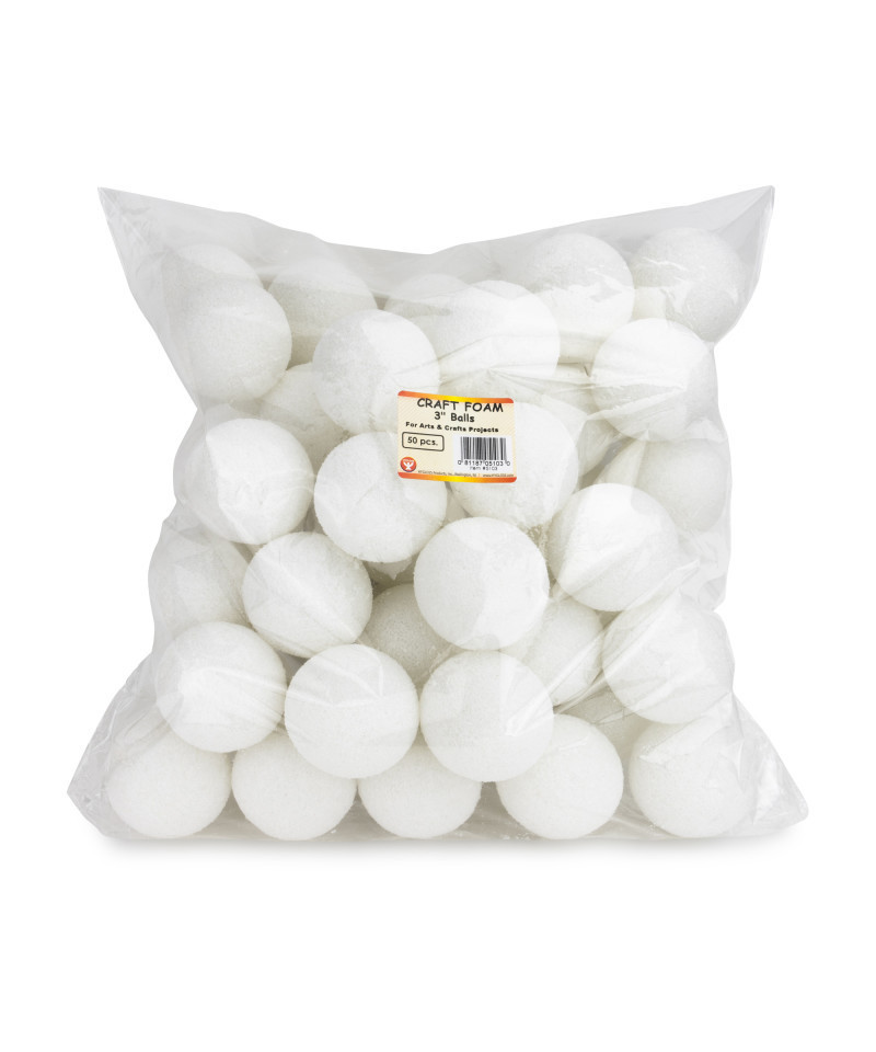 Craft Foam balls are the foundation of many fantastic crafts projects and decorations. Polystyrene Foam is simple to decorate, yet yields professional looking crafts. Use as a base for floral arrangements or craft centerpieces. Teachers love foam balls for science projects and models; you can even create a model solar system with the large selection of sizes! These balls are popular for creating and decorating holiday ornaments and decorations. So get out some tissue paper, sequins, paint and glue, and let your creativity start running! Foam Balls measure 3" in diameter. Each pack includes 50 craft foam balls.