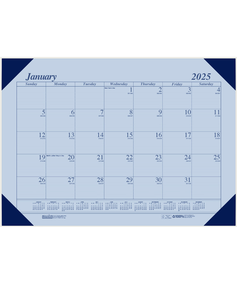 12 Months: August - July. Holder has 4 chipboard reinforced leatherette corners. Orchid paper with cordovan corners. Includes Julian dates and days remaining. Full year reference calendar on each month. Lightly ruled date blocks. Printed on 100% post-consumer recycled paper with soy ink. Block size: 2 1/4" x 1 7/8". Measures: 18 1/2" x 13". Made in USA