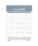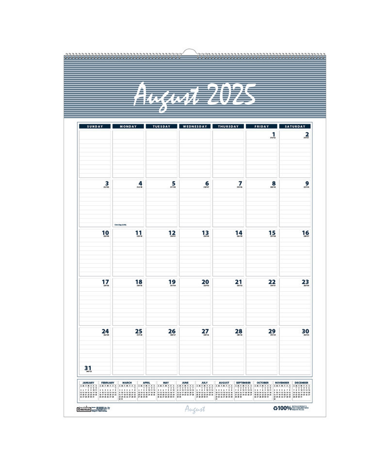 Academic Wall Calendar: August - July. Spiral bound with hanger. Measures 12" x 17". Block size: 1 1/2" x 2 1/4". Full year reference calendar on each month printed In Wedgwood blue and gray. Full chipboard backer. Printed on 100% post-consumer recycled paper. Made in USA
