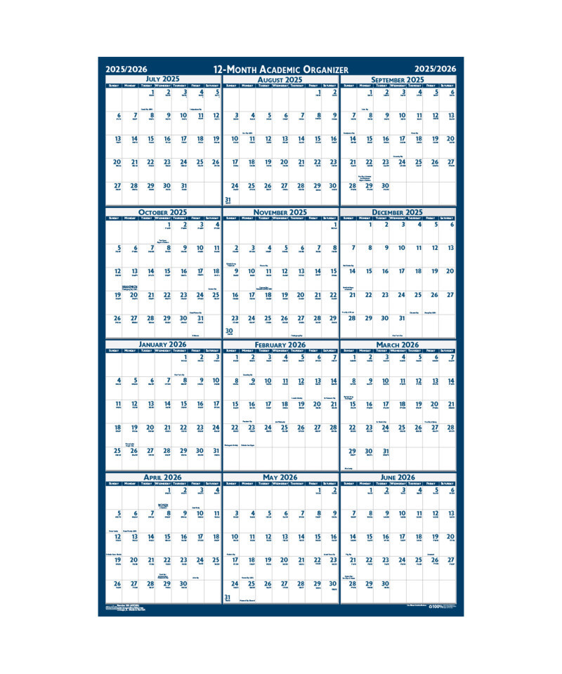 Laminated wall planner: July - June. Reverses from a vertical format to horizontal format. Includes Julian dates/days remaining. Generous space for notes and plans. Wipes clean with a damp cloth. Includes water soluble marker and hangers. Measures: 18" x 24". Block Size: 3/4" x 1" vertical and horizontal formats. Printed on 100% post-consumer recycled paper with soy ink. Made in the USA