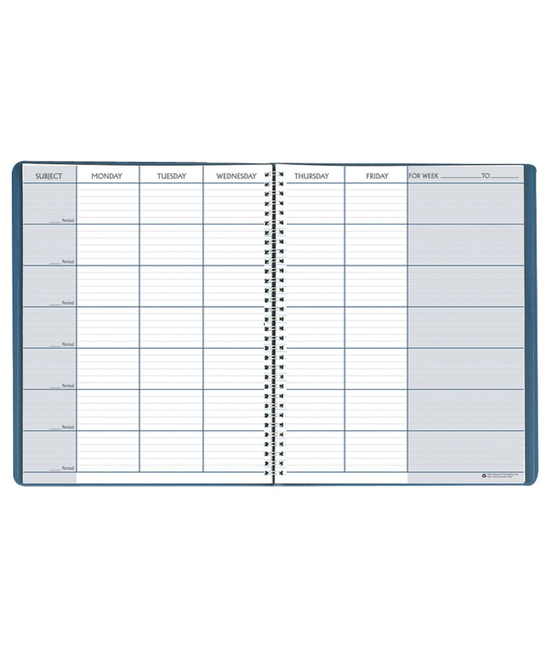 Includes seating chart, term program, test and attendance records. One week per two-page spread. 40 weeks / 7 periods. Days of the week are across the top and periods down the right hand side. Blue embossed simulated leather cover, non-refillable. Measures: 8 1/2" x 11". Printed on 100% post-consumer recycled paper with soy ink. Made in USA.