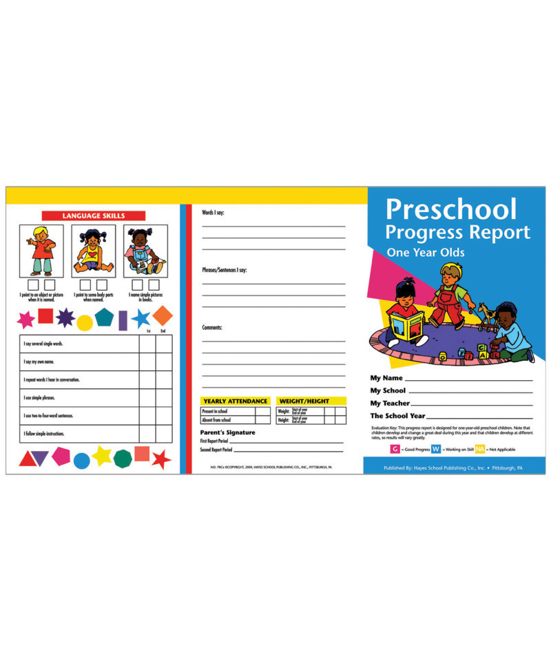Preschool Progress Reports designed for 1 year olds provide a detailed listing of achievements in various curriculum areas.