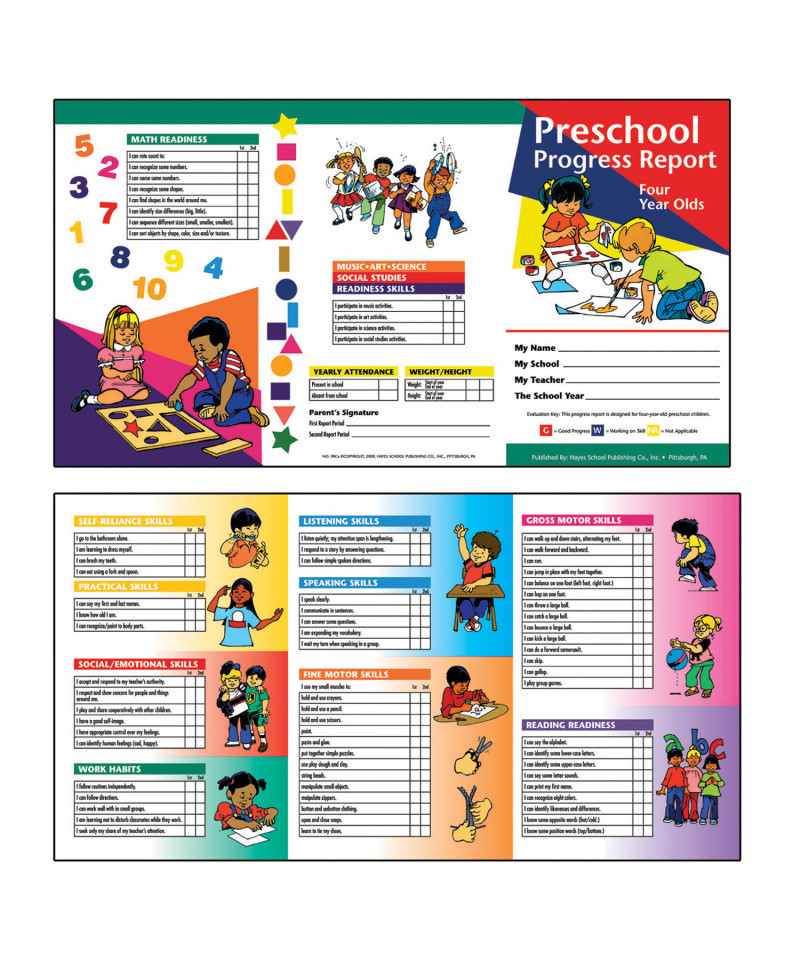 Preschool Progress Reports designed for 4 year olds provide a detailed listing of achievements in various curriculum areas. Colorful, easy-to-read Hayes reports help parents appreciate the progress their children have made. Areas include self-reliance skills, practical skills, social and emotional skills, work habits, listening and speaking skills, fine motor skills, gross motor skills, reading and math readiness and music, art, science, and social studies readiness skills. Evaluation Reports are 2 sided, full-color tri-fold sheets. Closed measure 5" x 8". Each pack includes 10 reports.